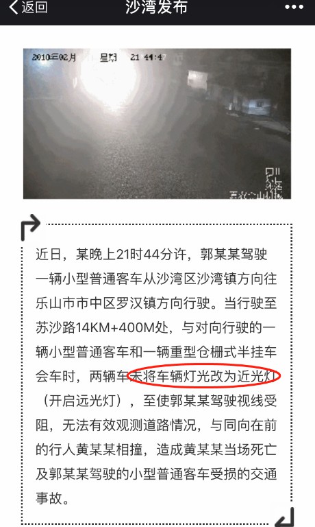 據(jù)“沙灣發(fā)布”4月26日報道,近日,某晚上21時44分許,郭某某駕駛一輛小型普通客車從四川省樂山市沙灣區(qū)沙灣鎮(zhèn)方向往樂山市市中區(qū)羅漢鎮(zhèn)方向行駛。當(dāng)行駛至蘇沙路14KM+400M處,與對向行駛的一輛小型普通客車和一輛重型倉柵式半掛車會車時,兩輛車未將車輛燈光改為近光燈(開啟遠(yuǎn)光燈),至使郭某某駕駛視線受阻,無法有效觀測道路情況,與同向在前的行人黃某某相撞,造成黃某某當(dāng)場死亡及郭某某駕駛的小型普通客車受損的交通事故。
