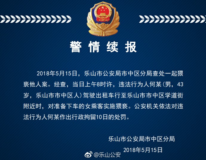 5月15日18時,四川樂山警方發(fā)布警情續(xù)報(bào),2018年5月15日,樂山市公安局市中區(qū)分局查處一起猥褻他人案。經(jīng)查,當(dāng)日上午8時許,違法行為人樂山市市中區(qū)何某,其駕駛出租車行至樂山市市中區(qū)學(xué)道街附近時,對準(zhǔn)備下車的女乘客實(shí)施猥褻。公安機(jī)關(guān)依法對違法行為人何某作出行政拘留10日的處罰。