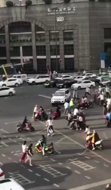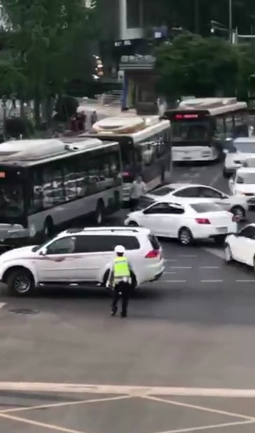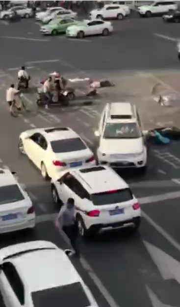 事故發(fā)生后,網(wǎng)上流傳著關(guān)于該案的現(xiàn)場視頻。一輛白色越野車在原地多次轉(zhuǎn)圈后,從順城大街逆向往鹽市口方向沖去,路口等待的多輛電瓶車被撞倒,最終撞向一輛白色汽車后停止。隨即,路口執(zhí)勤交警和公安將肇事車駕駛員控制。