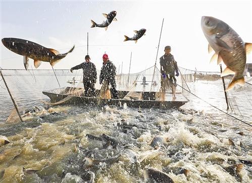 ▲江蘇省盱眙縣河橋鎮(zhèn)漁民在捕魚(yú)。盱眙縣不斷探尋水產(chǎn)養(yǎng)殖業(yè)高質(zhì)量發(fā)展之路,不斷提升當(dāng)?shù)厝罕娚钏健?周海軍攝