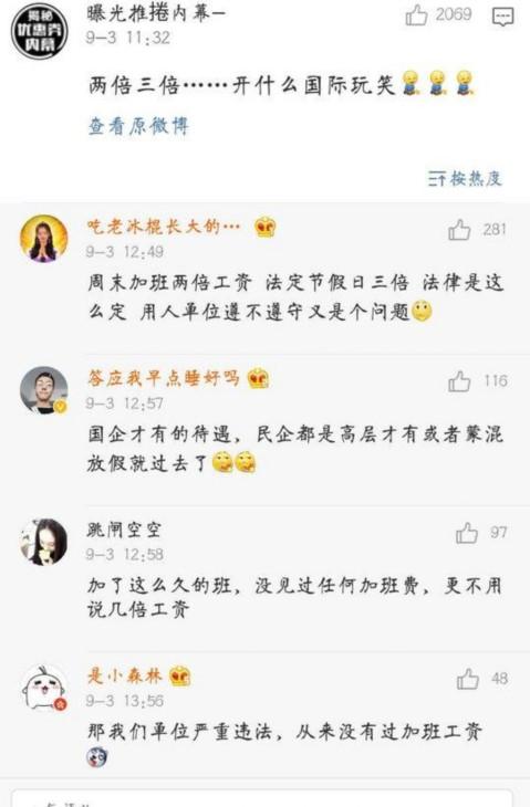 當(dāng)然,對于節(jié)假日給加班工資,網(wǎng)友也有話要說。“我們單位從來沒有給過加班工資”“兩倍、三倍,開什么國際玩笑?”“法律是這么規(guī)定的,用人單位遵不遵守又是個(gè)問題。”……看來,加不加班是個(gè)問題,能不能得到加班工資更是一個(gè)問題。