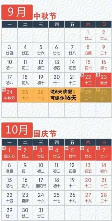 今年中秋節(jié)9月22日到24日放假,國慶節(jié)10月1日到7日放假。兩個(gè)假期隔了6天。這不,已經(jīng)有網(wǎng)友制定了兩份拼假攻略。
