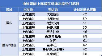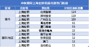 中秋期間上海虹橋、浦東機(jī)場(chǎng)出港熱門航線。