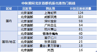 中秋期間北京首都機(jī)場(chǎng)出港熱門航線。