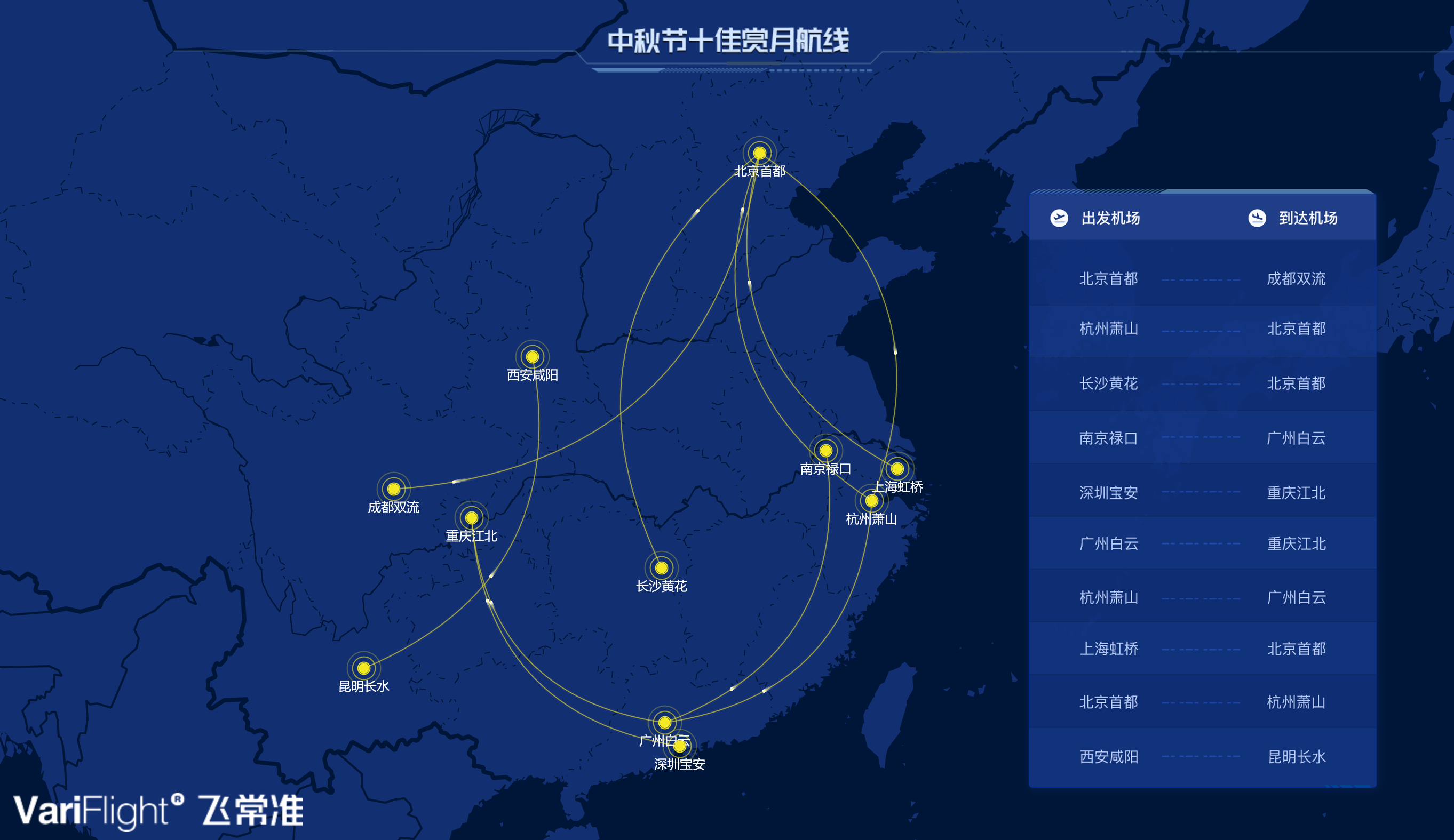 飛常準(zhǔn)大數(shù)據(jù)顯示,今年中秋節(jié)十佳賞月航線分別是北京首都-成都雙流、杭州蕭山-北京首都、長(zhǎng)沙黃花-北京首都、南京祿口-廣州白云、深圳寶安-重慶江北、廣州白云-重慶江北、杭州蕭山-廣州白云、上海虹橋-北京首都、北京首都-杭州蕭山、西安咸陽(yáng)-昆明長(zhǎng)水。