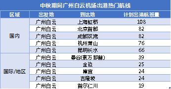 中秋期間廣州白云機(jī)場(chǎng)出港熱門航線。