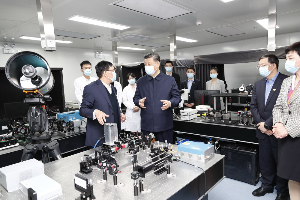 ↑2018年5月2日,習近平在北京大學金光生命科學大樓一層大廳認真聽取關于學校學科建設、人才隊伍建設、科研創(chuàng)新能力提升等情況介紹。