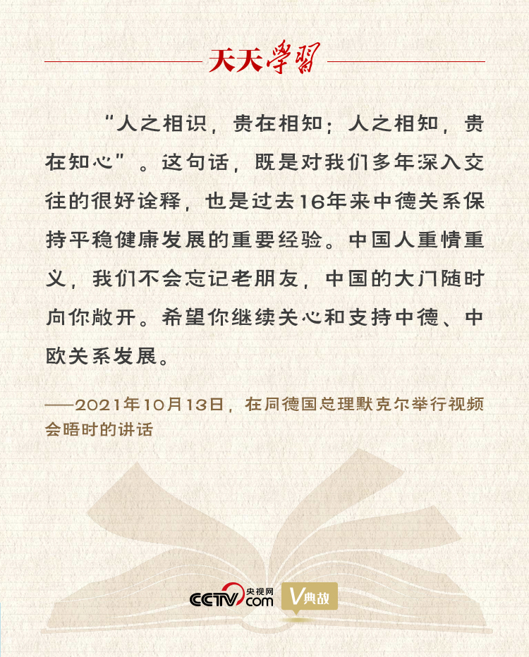 10月13日,習(xí)近平主席同德國總理默克爾舉行視頻會晤。雙方在友好的氛圍中回顧近年中德、中歐關(guān)系發(fā)展并就相關(guān)問題深入交換意見。習(xí)主席積極評價默克爾任內(nèi)為推動中德、中歐關(guān)系發(fā)展所作的貢獻(xiàn),并引用“人之相識,貴在相知;人之相知,貴在知心”,稱這句話“既是對我們多年深入交往的很好詮釋,也是過去16年來中德關(guān)系保持平穩(wěn)健康發(fā)展的重要經(jīng)驗”。