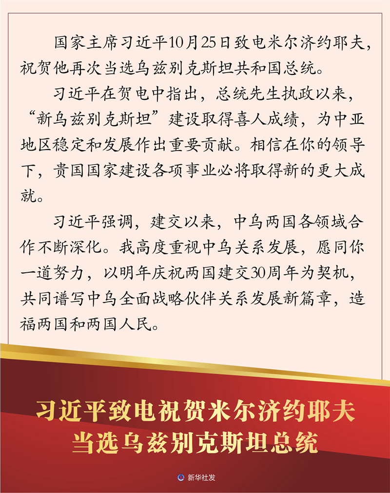 新華社北京10月26日電 國家主席習(xí)近平10月25日致電米爾濟約耶夫,祝賀他再次當(dāng)選烏茲別克斯坦共和國總統(tǒng)。