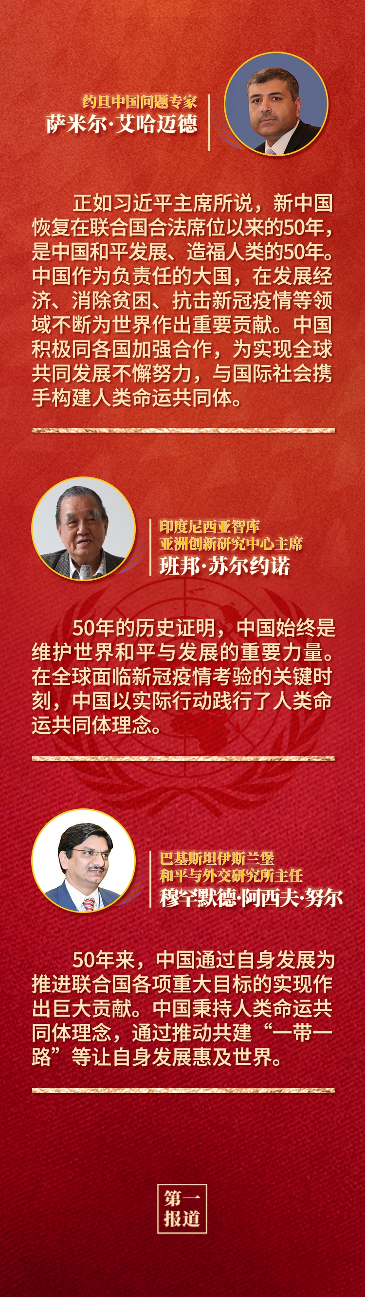 多國人士認(rèn)為,中華人民共和國恢復(fù)聯(lián)合國合法席位是世界和聯(lián)合國歷史上的一個(gè)大事件,習(xí)近平主席的重要講話回顧了中國和平發(fā)展、造福人類的50年,為實(shí)現(xiàn)世界永續(xù)和平發(fā)展提出重要倡議,為全球共同推動(dòng)構(gòu)建人類命運(yùn)共同體注入新的強(qiáng)大動(dòng)力。