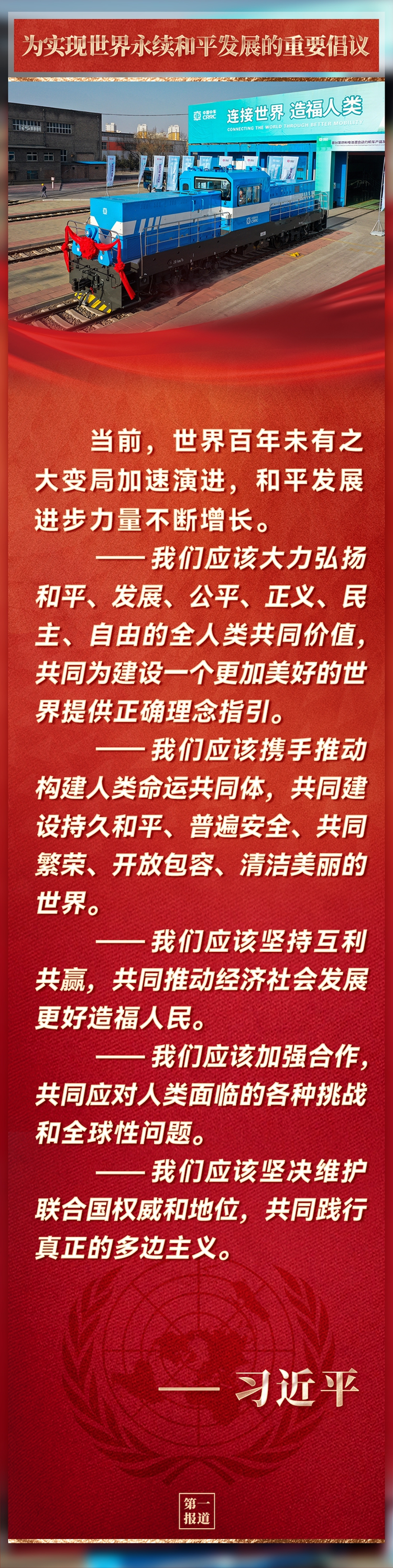 在中華人民共和國恢復(fù)聯(lián)合國合法席位50周年紀(jì)念會(huì)議上,習(xí)近平主席提出重要倡議。國際社會(huì)看到,中國智慧和中國方案再次為實(shí)現(xiàn)世界永續(xù)和平發(fā)展注入動(dòng)力。
