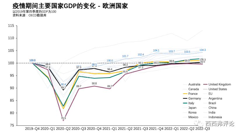 英法德意四個歐洲國家,從2019年四季度到2022年三季度,經(jīng)濟(jì)基本上原地踏步。