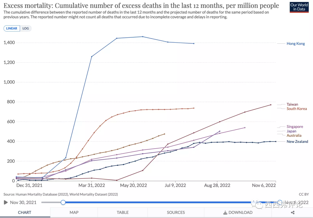 過去十二個月的累計超額死亡率,香港飆升到了萬分之十四,臺灣接近萬分之八,新加坡也超過了萬分之五。目前只有新西蘭,還在萬分之五以下。即使這樣,這幾個國家或地區(qū)在整個疫情期間的超額死亡率,仍然遠(yuǎn)遠(yuǎn)低于大部分歐美國家,他們?nèi)匀皇强挂叩膬?yōu)等生。