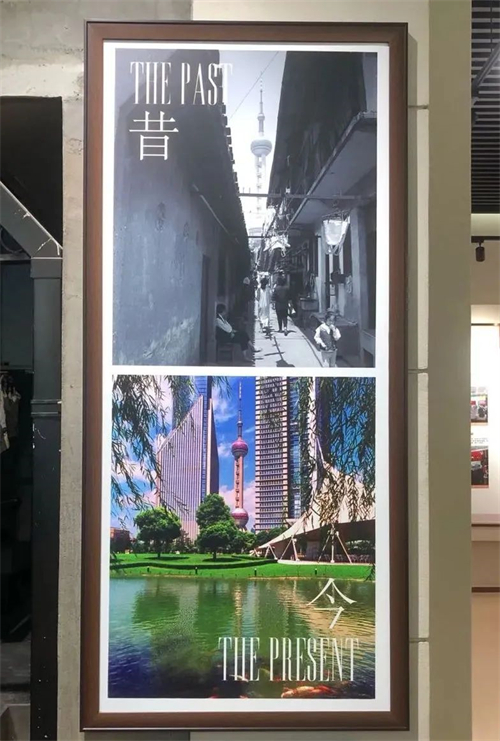 △展廳內,同一視角上海今昔對比圖。上面一張“爛泥渡路”照片,拍攝于1995年左右,下面一張照片則攝于近年,滿目高樓林立、綠草如茵。