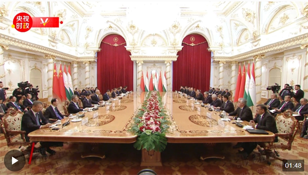 習(xí)近平指出,尊敬的拉赫蒙總統(tǒng)先生,我的老朋友,非常高興同你再次會晤。時(shí)隔5年再次到訪貴國,我看到了一個(gè)更加欣欣向榮的塔吉克斯坦。作為友好鄰邦和全面戰(zhàn)略伙伴,我們?yōu)榇烁械接芍愿吲d。