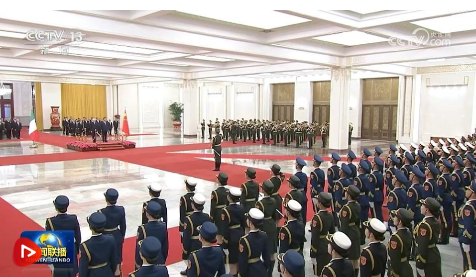 天安門(mén)廣場(chǎng)鳴放21響禮炮,禮兵列隊(duì)致敬。兩國(guó)元首登上檢閱臺(tái),軍樂(lè)團(tuán)奏中意兩國(guó)國(guó)歌。馬塔雷拉在習(xí)近平陪同下檢閱中國(guó)人民解放軍儀仗隊(duì),并觀看分列式。