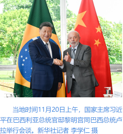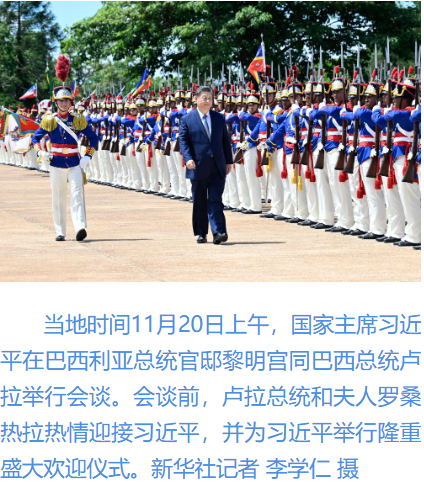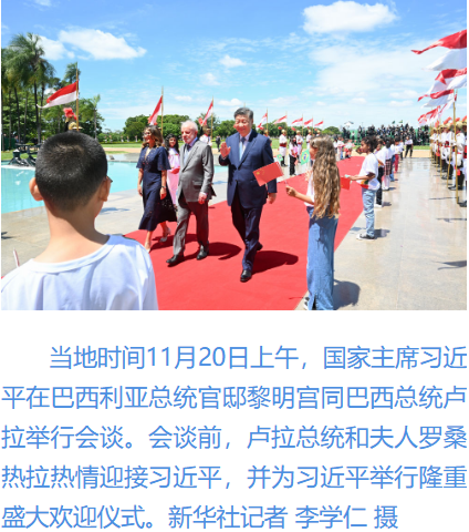 習近平指出,很高興在中巴建交50周年這個具有重要歷史意義的年份訪問巴西。剛才盧拉總統(tǒng)為我舉行最高禮遇的隆重歡迎儀式,充分體現(xiàn)了對中巴關系的高度重視以及對中國人民的深情厚誼,令我深受感動。中國和巴西是東西半球兩大發(fā)展中國家;厥走^去50年,中巴關系跨越山海,探索出發(fā)展中大國相互尊重、互利友好、合作共贏的正確相處之道。巴西是首個同中國建立戰(zhàn)略伙伴關系的國家、首個同中國建立全面戰(zhàn)略伙伴關系的拉美國家。近年來,在我和盧拉總統(tǒng)戰(zhàn)略引領下,兩國日益成為命運與共的可靠朋友、共促和平的積極力量,中巴關系正處于歷史最好時期,不僅增進了兩國人民福祉,也維護了廣大發(fā)展中國家共同利益,壯大了全球南方的力量和聲音,為世界和平穩(wěn)定作出突出貢獻。
