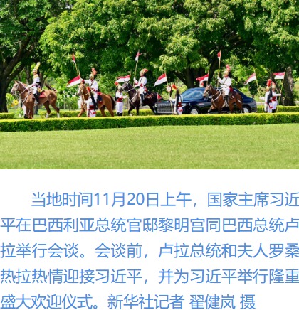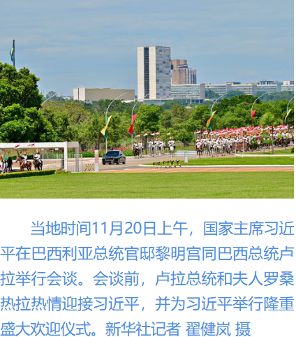 初夏時節(jié)的巴西利亞,天朗氣清。黎明宮內(nèi),綠草如茵,450名威武禮兵整齊列隊。在120名龍騎兵護衛(wèi)下,習近平乘車抵達黎明宮前廣場。