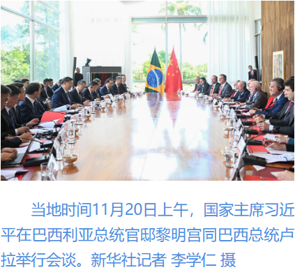 新華社巴西利亞11月20日電(記者倪四義 陳威華)當?shù)貢r間11月20日上午,國家主席習近平在巴西利亞總統(tǒng)官邸黎明宮同巴西總統(tǒng)盧拉舉行會談。兩國元首宣布,將中巴關系定位提升為攜手構建更公正世界和更可持續(xù)星球的中巴命運共同體。