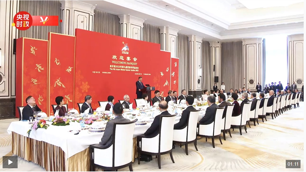 2月7日中午,國家主席習(xí)近平和夫人彭麗媛在黑龍江省哈爾濱市太陽島賓館舉行宴會,歡迎來華出席哈爾濱第九屆亞洲冬季運(yùn)動(dòng)會開幕式的國際貴賓。
