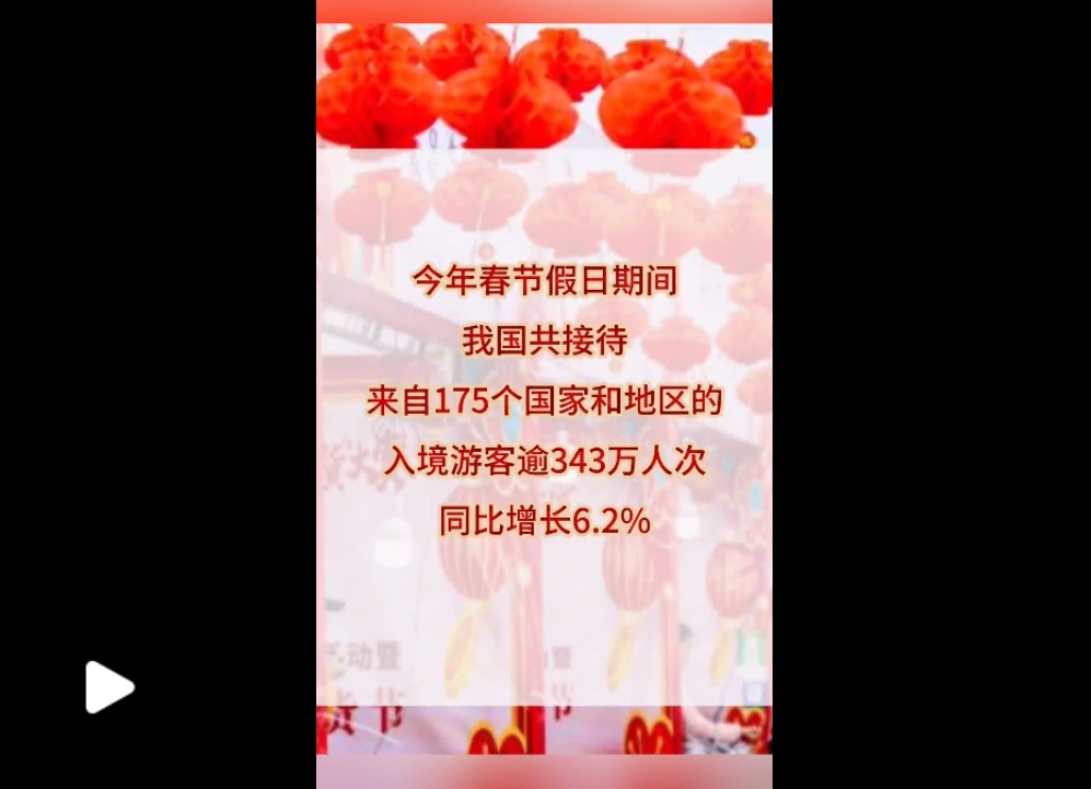 首個(gè)“非遺版”春節(jié),普天同慶,五洲同春。“來(lái)華體驗(yàn)中國(guó)年”,是其中一道動(dòng)人的風(fēng)景。中國(guó)的高鐵上、景區(qū)里,時(shí)?梢(jiàn)外國(guó)游客的身影。數(shù)據(jù)顯示,今年春節(jié)假日期間,我國(guó)共接待來(lái)自175個(gè)國(guó)家和地區(qū)的入境游客逾343萬(wàn)人次,同比增長(zhǎng)6.2%。