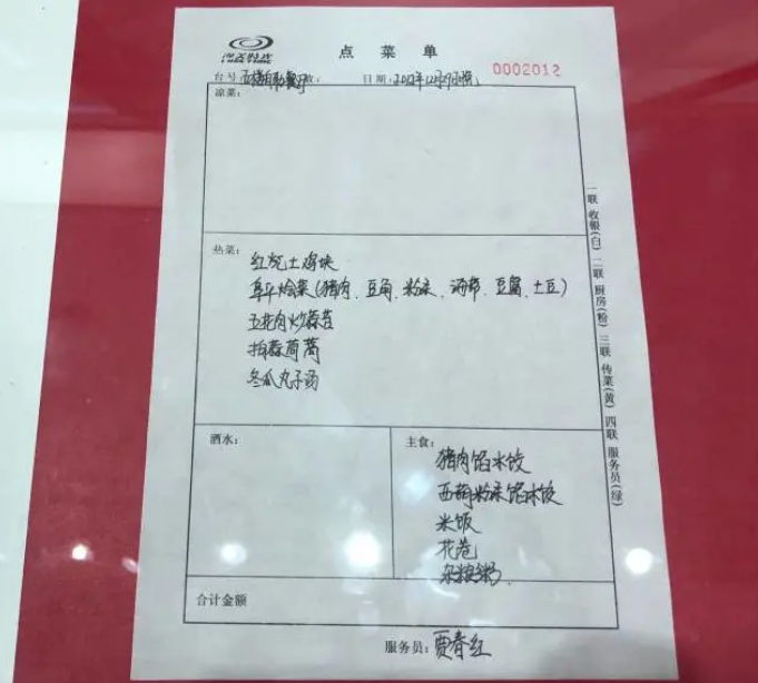 一張菜單,內(nèi)容是標(biāo)準(zhǔn)的“四菜一湯”:紅燒土雞塊、阜平燴菜、五花肉炒蒜薹、拍蒜茼蒿、冬瓜丸子湯。主食也很簡單。落款日期是2012年12月29日。