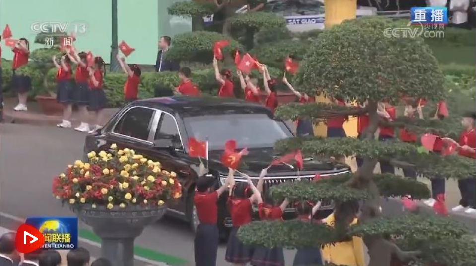 歡迎儀式后,習(xí)近平和蘇林一同步行前往越共中央駐地舉行會(huì)談。沿途數(shù)百名越南民眾揮舞兩黨兩國(guó)旗幟,對(duì)習(xí)近平表示最熱烈的歡迎。習(xí)近平向歡迎人群揮手致意。