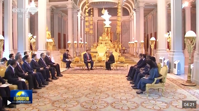 4月17日下午,柬埔寨國王西哈莫尼同中國國家主席習(xí)近平在金邊王宮舉行會(huì)見。