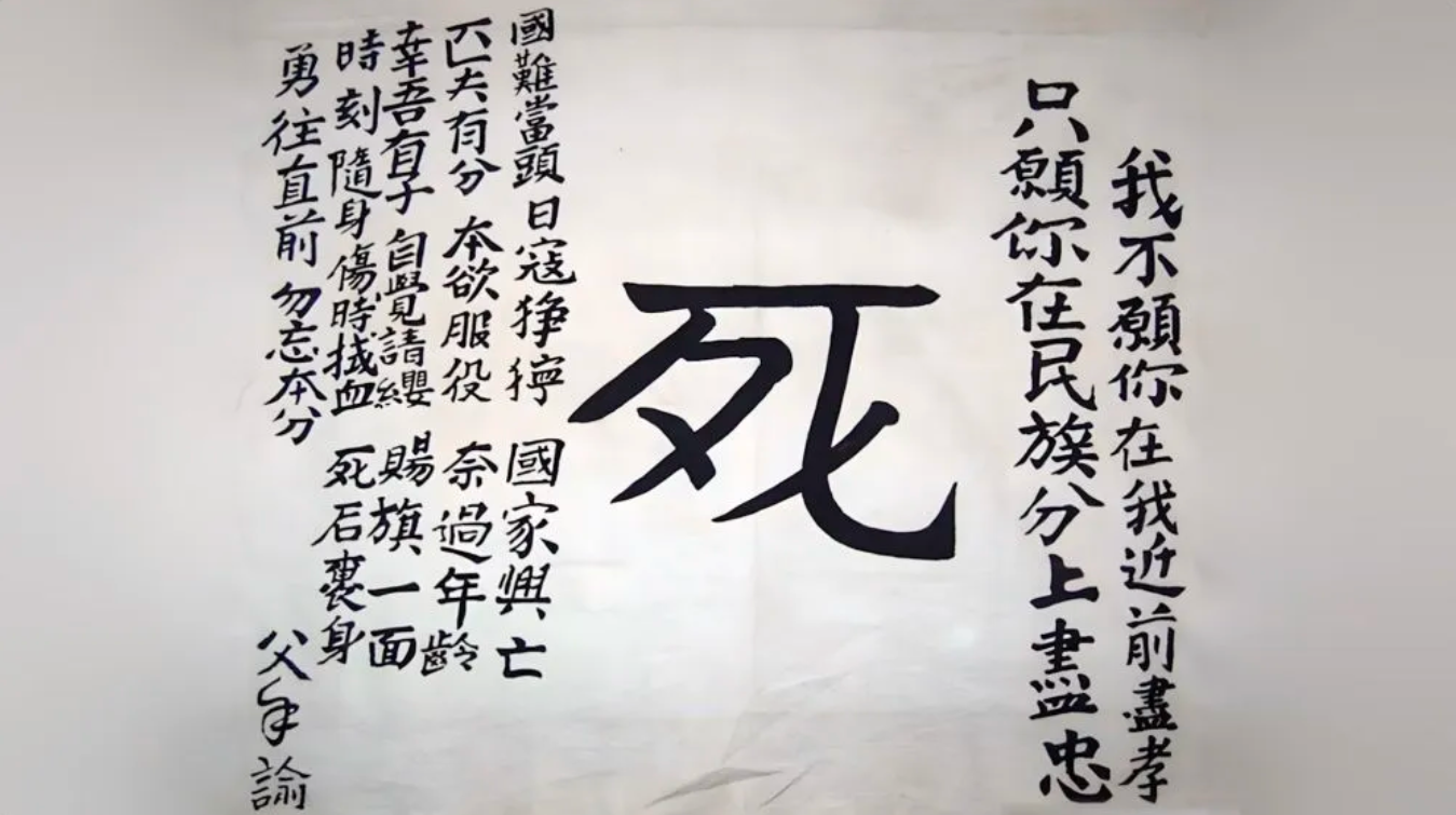 1937年9月,一位名叫王者成的中國(guó)父親把這面“死”字旗交給即將上戰(zhàn)場(chǎng)的兒子。
