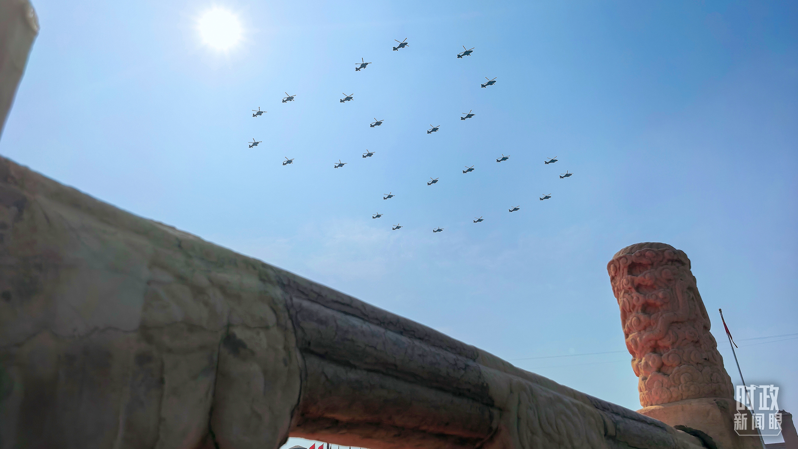 空中護(hù)旗梯隊(duì)率先亮相分列式環(huán)節(jié),26架直升機(jī)組成巨大的“80”字樣。教練機(jī)梯隊(duì)拉出14道彩煙,向中華民族14年可歌可泣的抗戰(zhàn)歷程致敬,向14億多中國(guó)人民奔向強(qiáng)國(guó)復(fù)興的不懈奮斗致敬。