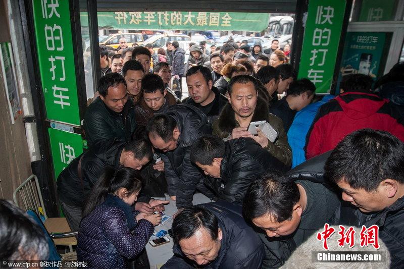2014年2月19日,杭州,隨著“嘀嘀”、“快的”兩家打車軟件的“燒錢”競(jìng)賽愈演愈烈,眾多出租車司機(jī)來(lái)到兩家打車軟件公司的杭州服務(wù)點(diǎn),排隊(duì)安裝司機(jī)版軟件。司機(jī)們表示,安裝打車軟件,一是為了緊跟潮流方便做生意,二是可以得到更多的“獎(jiǎng)勵(lì)”補(bǔ)貼。