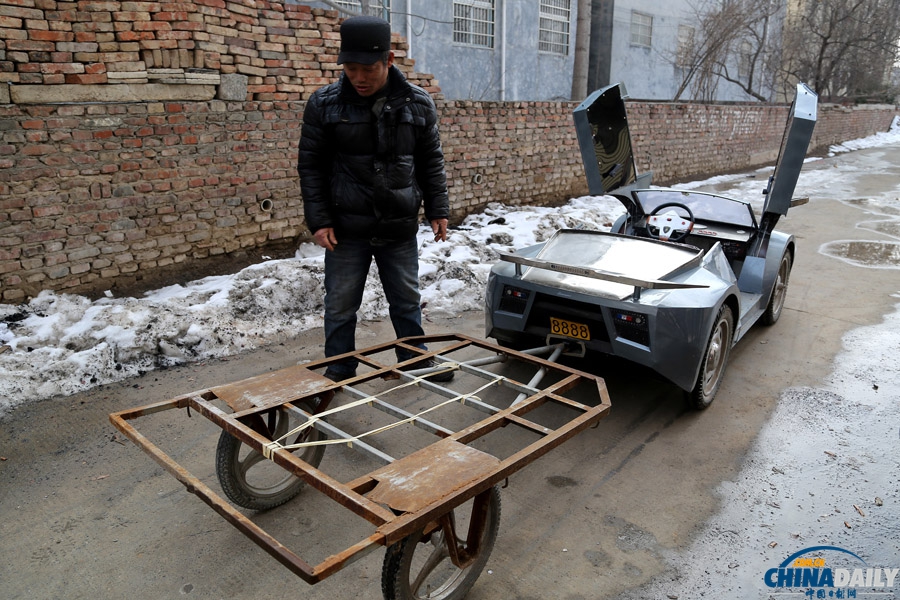 老郭平時做點小生意,為了拉東西,特意在車子后部設(shè)計了掛鉤,可與板車連接,跑車變成拖車。(侯建勛 攝)