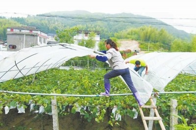 臺(tái)風(fēng)“蘇迪羅”造成福安多個(gè)鄉(xiāng)鎮(zhèn)的葡萄園進(jìn)水、大棚損壞。圖為連日來(lái),松羅鄉(xiāng)尤沃村果農(nóng)加緊搶修葡萄園避雨大棚。何小麗 鄭祖輝 攝“蘇迪羅”卷走!