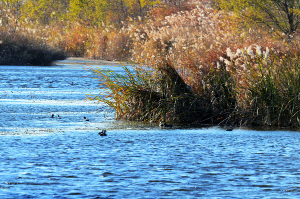 水鳥在濕地覓食、游弋(11月17日攝)。初冬時節(jié),山東省萊西市姜山濕地碧波蕩漾,成片蘆葦隨風搖曳,數以千計的鳥兒在蘆葦叢中棲息、飛翔。該濕地總面積達2萬畝,……