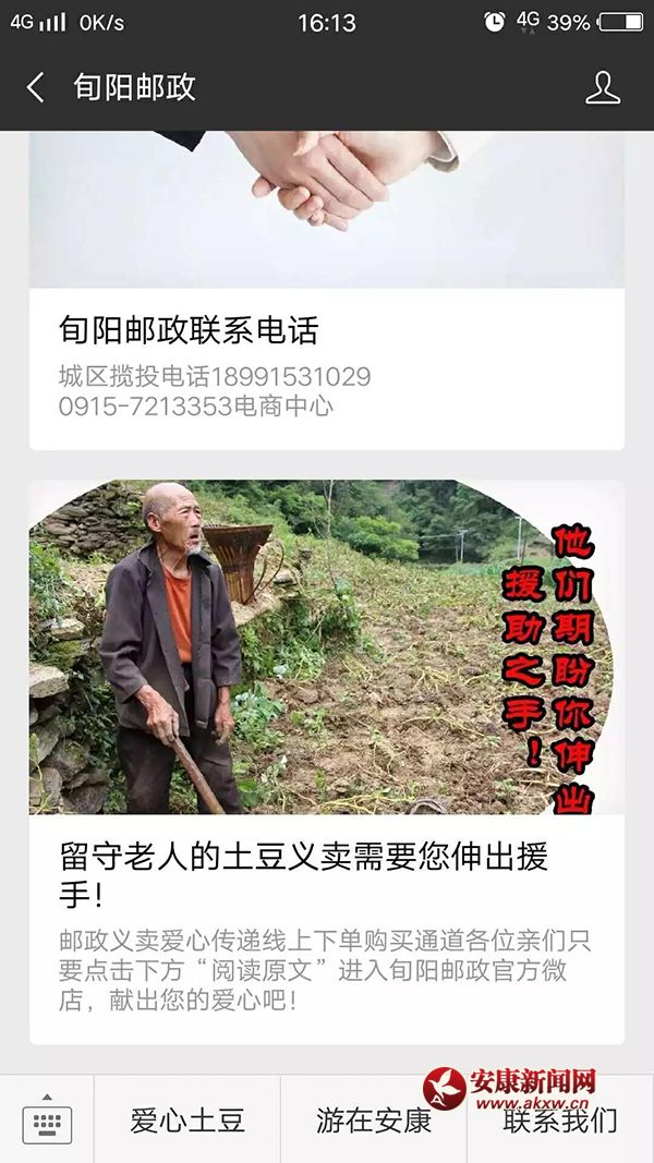 一是關(guān)注旬陽郵政微信公眾號(hào),點(diǎn)擊右下角的“愛心土豆”鏈接,進(jìn)入旬陽郵政官方微店直接購買;