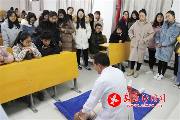 此次培訓(xùn)分為兩部分,第一部分由血源管理科侯捷擔(dān)任主講,培訓(xùn)以“無償獻血•點亮生命”為主題,將“無償獻血的概念及重要意義”、“無償獻血的基本情況”、“什么人可以獻血”、“無償獻血的好處”、“無償獻血注意事項”、“無償獻血的普遍誤區(qū)”等內(nèi)容結(jié)合起來,用生動有趣的語言為大家上了一堂無償獻血科普知識培訓(xùn)課。培訓(xùn)第二部分由獻血服務(wù)科劉潤安主講“心肺復(fù)蘇”,并現(xiàn)場為所有同學(xué)演示了心肺復(fù)蘇急救的全過程,同時還邀請了幾位感興趣的同學(xué)上臺,指導(dǎo)他們對人體模型進行模擬演練,現(xiàn)場互動連連,氣氛十分熱烈。
