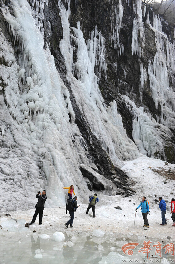 昨日下午2時(shí),游客在戶縣澇峪黑山瀑布前合影留念。不時(shí)有冰塊從瀑布上方掉落,著實(shí)讓人捏了一把汗 記者 趙彬 攝
