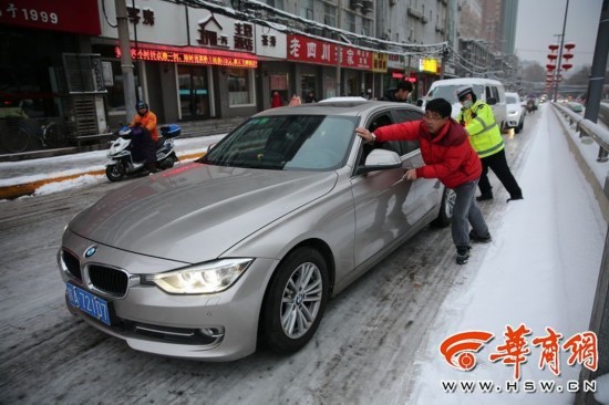 1月4日在西安市咸寧路上,雪后路面太滑,紅燈停下后,寶馬車(chē)打滑都無(wú)法起步。 華商記者 鄧小衛(wèi) 攝影報(bào)道