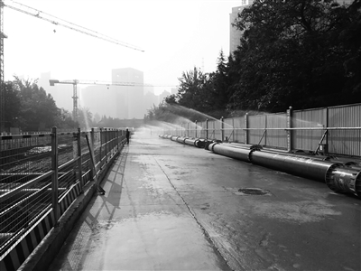 在西安地鐵五號線6標中鐵電氣化局施工的高新四路車站工地記者看到,作為西安地鐵首批噴淋系統(tǒng)試驗點,施工單位將防塵減霾噴淋系統(tǒng)安裝在工地圍欄1.5米高位置,管線長度達680米,噴頭68個,其中,每10米設(shè)置一個旋轉(zhuǎn)噴頭,噴射射程最大可至12米,覆蓋的面積約3000多平方米。每個噴頭上設(shè)置有閥門,可根據(jù)現(xiàn)場情況,調(diào)節(jié)射程、水量及角度。