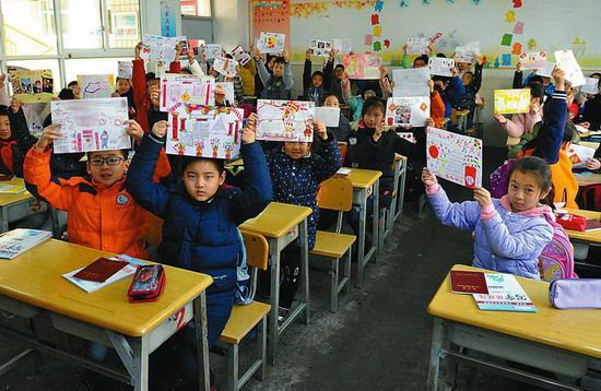 西安一小學的學生展示自己創(chuàng)作的海報作品。陜西日報記者 杜瑋攝