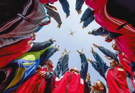 騰空而起的無人機讓孩子們頓時歡呼雀躍起來。通訊員 賀粵軍攝