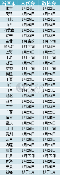 | 注:資料來源于各省日報,人大、政協(xié)網(wǎng)站或當?shù)匦麄鞑块T,內(nèi)容截至1月5日,實際時間以當?shù)貢h召開時間為準。 |