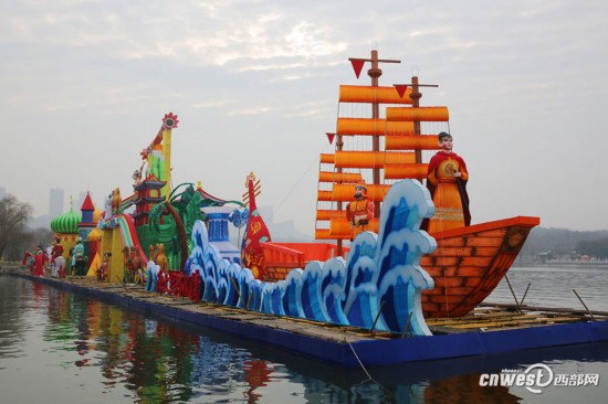 1月22日,記者走進(jìn)大唐芙蓉園,環(huán)芙蓉湖一圈,見(jiàn)2018新春燈會(huì)的大型燈組已基本到位,規(guī)模氣勢(shì)超大唐芙蓉園歷屆燈會(huì)。這組水上燈組濃縮了水陸絲綢之路風(fēng)情。y89安康新聞網(wǎng)