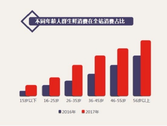 對(duì)比不同年齡段的消費(fèi)結(jié)構(gòu)可以發(fā)現(xiàn),50后、60后和70后用戶的生鮮消費(fèi)在全站消費(fèi)占比最高,可見“銀發(fā)經(jīng)濟(jì)”效應(yīng)在生鮮電商領(lǐng)域更為明顯,網(wǎng)上買菜、買肉的習(xí)慣也在逐步取代菜市場(chǎng)在中老年人心里的地位。