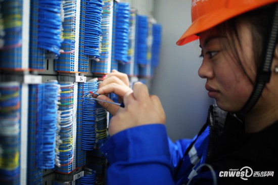 十多平米的設(shè)備房?jī)?nèi)一片繁忙景象,四排信號(hào)機(jī)柜整齊排列,機(jī)柜里、地面上散落著很多線纜,每排柜子間都有一兩個(gè)忙碌的女工,她們神情專注,各色的線纜在手上飛舞。