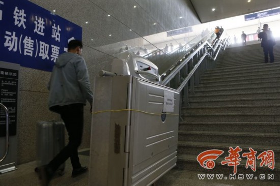 在地面一層,“親情服務(wù)崗”工作人員表示,如果出行的殘疾人是從地鐵口出來(lái),根本不用乘升降機(jī),只需在負(fù)一層的高鐵售票窗口買(mǎi)好高鐵票,然后拿著票到鐵路到達(dá)口4的地方,找工作人員,他們就會(huì)將人直接帶到列車(chē)上。記者納悶的是,讓殘疾人的設(shè)施成了擺設(shè),而貼心服務(wù)為何又不公之于眾。 華商報(bào)記者 苗巧穎 攝影 張杰