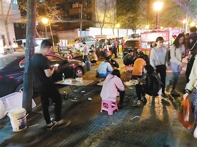4月1日晚8時許,記者來到交大街,蘭蒂斯城小區(qū)門前熱鬧不已。麻辣燙、砂鍋、炒面、餃子、餛飩、米線、臭豆腐……各種小吃應(yīng)有盡有,近20個小攤販把小區(qū)門前的人行道包圍得水泄不通。每個小吃攤都有不少食客,生意紅火的同時,地面上卻是一片狼藉。