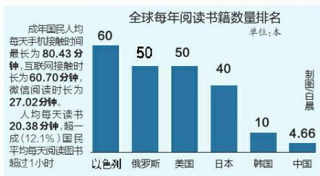 有網(wǎng)絡(luò)資料顯示,全世界每年閱讀書籍?dāng)?shù)量排名第一的是以色列,平均每人一年讀書量超過60本,俄羅斯和美國均在50本左右,而就算是我們的鄰居日本也達(dá)到40本左右,韓國較少卻也在10余本的水平。