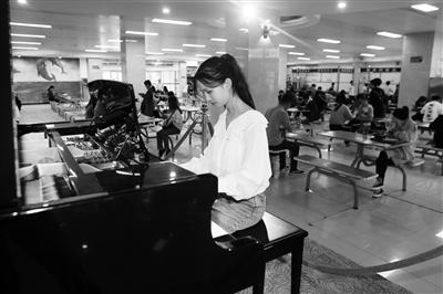 大學食堂里一架鋼琴的亮相,平添了幾分文藝范。學生小張說,聽著鋼琴曲吃飯,愣是把一碗油潑面吃出西餐的感覺來。
