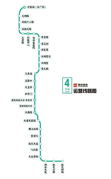 線路依次貫穿西安航天基地、曲江新區(qū)、雁塔區(qū)、碑林區(qū)、未央區(qū)、經濟技術開發(fā)區(qū),途經西安北站、大明宮國家遺址公園、火車站、五路口、大雁塔、大唐芙蓉園、曲江池遺址公園等人流密集區(qū),全線設車站29座,均為地下站,設航天城車輛段1座,草灘停車場1座。開通初期因西安火車站改造,故該站甩站運行,各次列車不停站通過。按照現(xiàn)行票價政策,四號線全程票價為8元。